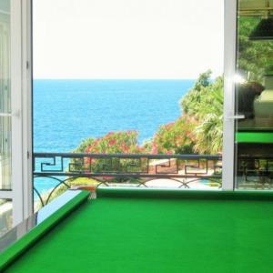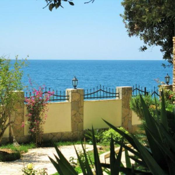 На самом берегу Адриатического моря в местечке Утеха в 8 км. от г. Бар построена вилла общей площадью 497 м2. Край террасы первого этажа находится в 10 метрах от воды и в 25 метрах от небольшого галечного пляжа, к которому ведет удобный спуск. Территория обнесена высокой каменной оградой с кованым обрамлением, что создает ощущение приватности и уюта в маленьком садике с пальмами, мандариновым и лимонным деревьями, а также кумкуатом. Вилла состоит из двух частей - основного хозяйского здания, и части для работников (или гостей) с отдельным входом, где располагается однокомнатный апартамент со своей кухней, душевой, балконом и благоустроенной мансардой. Вход в большой дом начинается с широкой каменной лестницы, ведущей на крыльцо, обрамленное колоннами. Массивная двустворчатая входная дверь отделана деревом по металлической основе. Все деревянные изделия сделаны и привезены по заказу из Испании. На первом этаже почти весь объем помещений воспринимается как единое целое и в то же время понятно функционально распределен. Это каминный зал с большим открытым камином, отделанным мрамором и гранитом, бело-зеленая столовая с овальным стеклянным столом, и большая кухня с островом, полностью оборудованная техникой для кулинарных упражнений. Белая столовая одной стеной (из стекла) полностью сообщается с террасой первого этажа, где стоит большой круглый стол, и где в теплое время зимой и все время летом, под шум прибоя, можно приятно провести время с друзьями и семьей. Там же, в уютном уголке, расположен мягкий диван. Почти вся терраса первого этажа прикрыта от солнца и дождя козырьком террасы второго этажа, опирающимся на белые колонны. Небольшой бассейн с пресной водой тут же, между колоннами. Подводная подсветка создает неповторимый эффект в вечернее время. На первом этаже так же есть телевизионная комната, с видео и аудиосистемой, угловым диваном, и панорамными окнами от пола до потолка, с видом на море и садик. Рядом располагается гостевой санузел с душем, отделанный неполированным гранитом, с хрустальными светильниками. На второй этаж ведет полукруглая винтовая лестница. Здесь располагается хозяйская спальня с застекленной стеной и выходом на террасу над морем. У этой спальни персональный санузел, отделанный травертином (вид мрамора). Также из холла двери ведут во вторую спальню, кабинет и санузел с душевой. Все обставлено основательной итальянской мебелью, качественной и удобной. В кабинете стоит диван, который, в случае необходимости, можно разложить, и устроить спальное место для задержавшихся гостей. Если нет необходимости в обслуживающем персонале или охране, то можно объединить весь дом в один присоединив апартамент обслуги (охраны) по плоскости второго этажа. Тогда второй этаж будет состоять из трех спален, кабинета (еще спальни), двух террас и трех санузлов. Третий этаж. Пройдя по той же лестнице наверх Вы попадаете в просторный зал. Здесь стоит 12 футовый бильярдный стол для игры в снукер. Он привезен из Германии по специальному заказу и смонтирован мастером с учетом всех тонкостей этой аристократической игры. Сбоку находится столик с зеленым сукном для карточных игр или пасьянса. Огромное помещение – практически оранжерея под полукруглой крышей, с колоннами, отделанными серым мрамором. Стеклянные двери ведут на открытую, 