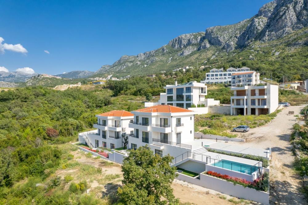 Комплекс из двух новых вилл с бассейнами и видом на море в Режевичи, в поселке Смоков Виенац, на удалении от магистральной дороги, на расстоянии около 300 метров от моря, на участках площадью 635 м2 и 575 м2.